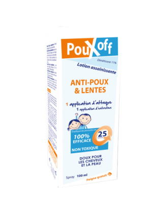 PouxOff Lotion assainissante pour enfant est un traitement efficace contre les poux et les lentes qui exerce une double action physique en étouffant et déshydratant les parasites. Elle agit rapidement et éradique les parasites en seulement 25 minutes.
