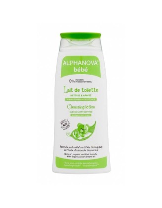 Le Lait de Toilette ALPHANOVA BIO étant particulièrement doux; il peut aussi être utilisé quotidiennement par maman pour se démaquiller. Verser le Lait de toilette sur un coton ou directement sur la peau. Frotter délicatement pour enlever les impuretés. Lait de Toilette hydratant: soin cosmétique certifié biologique pour les peaux normales et sèches des bébés. Formule onctueuse dorigine naturelle à lhuile damande douce bio et aux extraits de Calendula et de Lys bio.Laisse la peau propre, apaisée et protégée. Usage quotidien - Nettoyage de la peau (fesses, visages,.) Ce soin est : sans paraben, sans phenoxyethanol, sans triclosan, sans formaldehyde, Hypoallergénique*** et testé sous contrôle dermatologique sans huiles essentielles et sans allergènes 99.3% d'origine naturelle et certifié biologique par ECOCERT très doux, il n'utilise que des composants reconnus pour leur absence de toxicité et leur bonne tolérance cutanée. sans colorant, sans composants d'origine animale sans phtalates, sans muscs nitrés et polycycliques