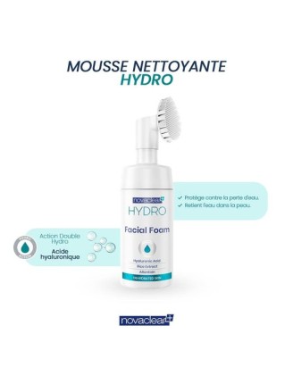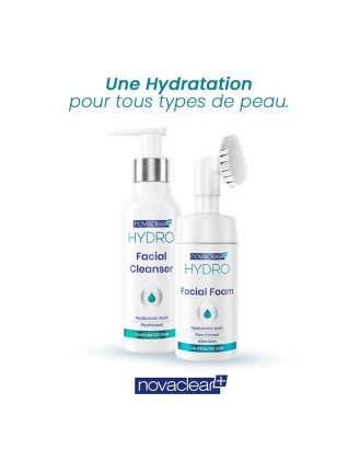 La mousse nettoyante hydratante NOVACLEAR HYDRO FOAM contient de l'acide hyaluronique de faible et moyenne poids moléculaire qui élimine en douceur les impuretés de la peau, la laissant douce et propre.